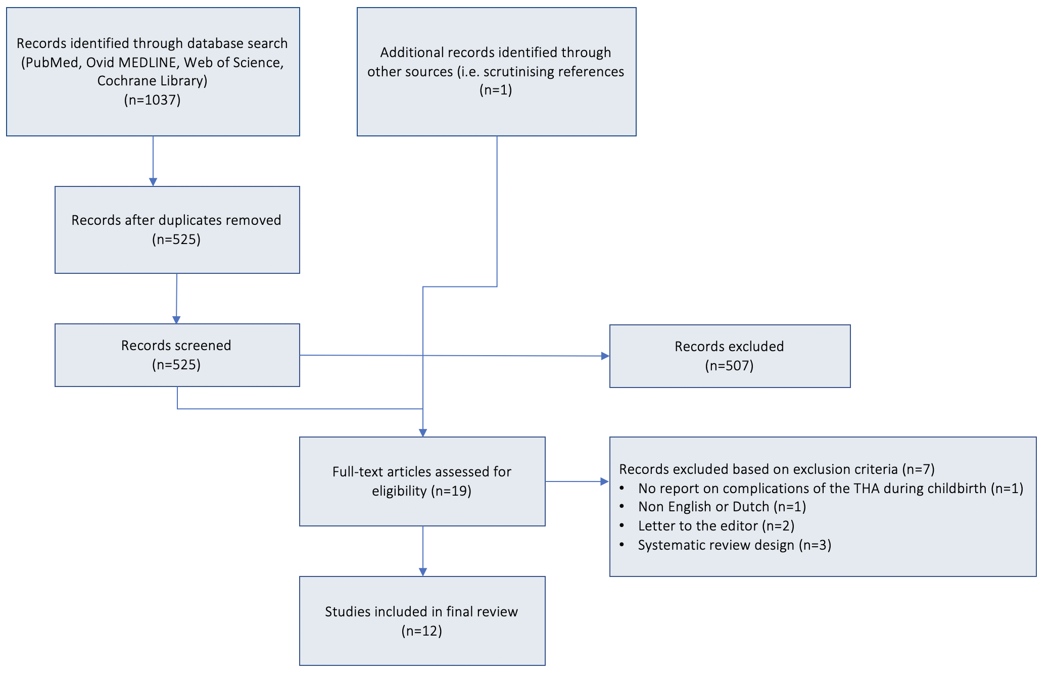 Introduction Total hip arthroplasty (THA) is performed to reduce pain, restore function, and improve quality of life in patients with disabling hip pain due to a variety of conditions1. Initially, the procedure was restricted to elderly patients with low physical demands. Indications for THA have expanded and currently also include conditions in more active and younger patients. The number of patients of reproductive age receiving a THA is on a rise2,9. In the Netherlands, approximately 30.000 THAs are performed annually, of which 4% are placed in patients aged younger than 50-years of age10. The most common indications for THA in patients of fertile age are rheumatoid arthritis, avascular necrosis of the femoral head and developmental dysplasia of the hip (DDH)2. Dislocation is a frequently encountered adverse event following THA. It affects 0.2-10% of patients after primary THA and up to 28% of patients with revised THAs3,4. Female patients are more at risk for dislocation (3-2:1 ratio). This might be explained by a lower muscle tone, less muscle strength and increased soft tissue compliance5,6. Young female patients who have undergone THA might want to start a family or increase their family size. These patients tend to have concerns regarding implant dislocation during pregnancy and vaginal delivery. Furthermore, healthcare providers involved in consultation of pregnant women with a THA may have insufficient experience in regard to the safety of the implant during pregnancy and childbirth. During pregnancy the corpus luteum secretes the hormone relaxin. This hormone has been identified as a major contributor in the increase of joint laxity around the pelvis to ensure successful delivery7,8. In addition, stressful forces are placed on the pelvic region during childbirth. These factors could make women more prone to dislocate their THA during childbirth. In this systematic review we aimed to evaluate the risk of THA dislocation during childbirth. Secondly, we aimed to provide some practical advice which can be used during consultation of pregnant women with a THA. Methods Eligibility criteria Studies were eligible if: (1) they included pregnant women with a THA; (2) they reported on complications (dislocation) of the THA during childbirth; (3) the full text article was available; and (4) the article was written in English or Dutch.
