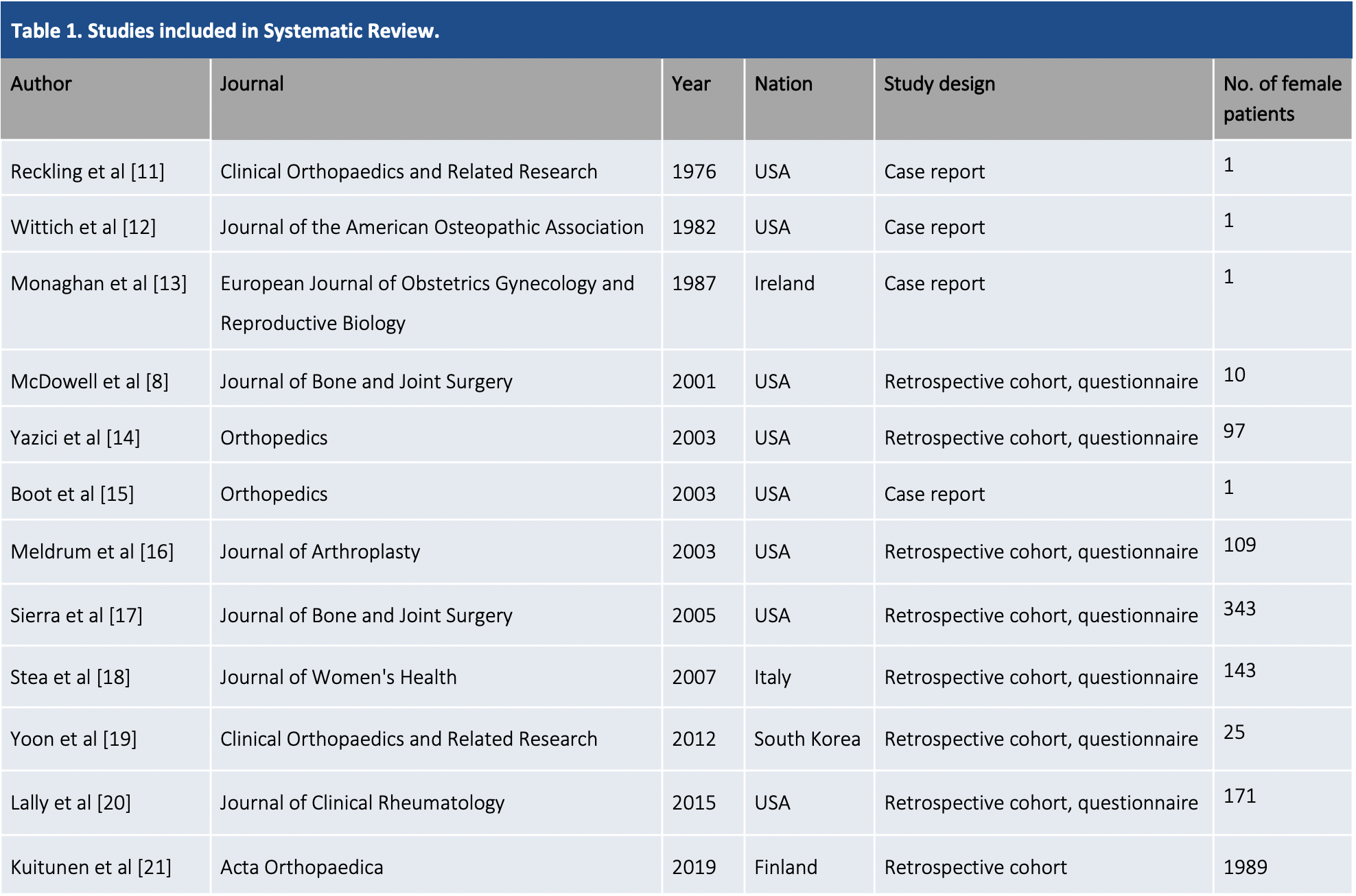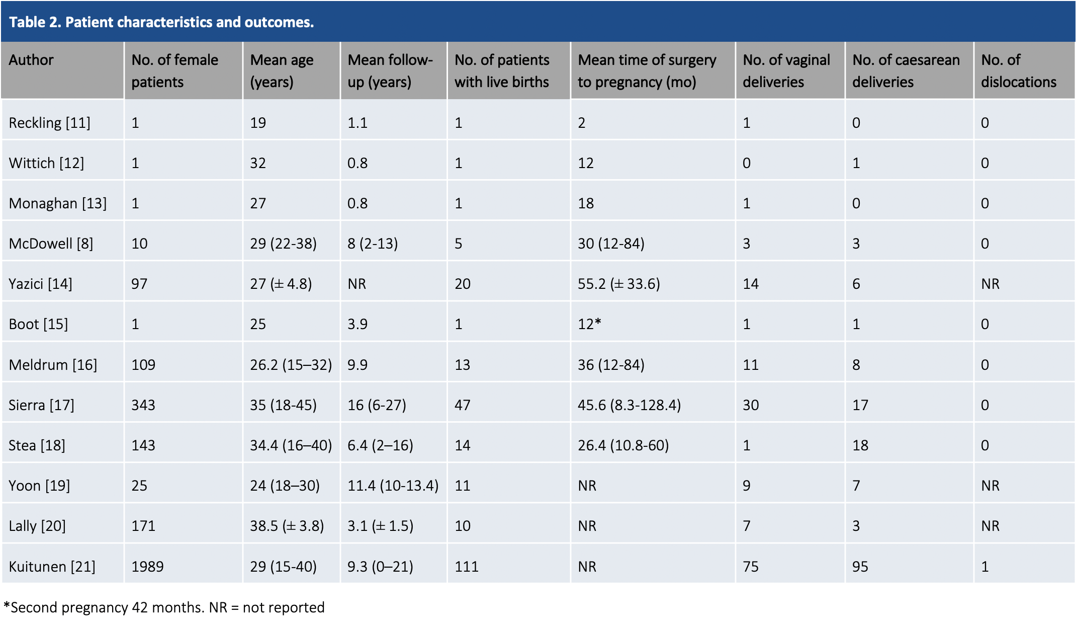 Study selection and data extraction Each article was reviewed in detail and assessed for eligibility based on title and abstract. Hereafter, full-text articles were evaluated and checked by two independent reviewers (LdB and JP). Data extraction was performed by the first author under supervision of the senior author. Data extracted included: author, journal of publication, year of publication, nation of publication, study design, number of female patients, mean age, mean follow-up, number of patients with live births, mean time of surgery to pregnancy, number of vaginal deliveries, number of caesarean deliveries, and number of dislocations.