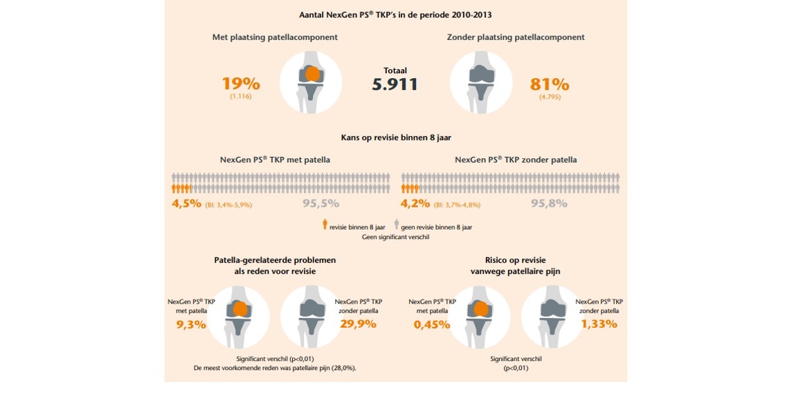 Het onderzoek is uitgevoerd met LROI-data door Gerian Huitema, Lieke de Vries, Tom Verboom, Anneke Spekenbrink-Spooren en Jeroen Steens. Zij concludeerden dat deze studie geen significant verschil laat zien in revisiepercentage binnen 8 jaar na plaatsen van een primaire NexGen PS® totale knieprothese met of zonder patellacomponent. Patella-gerelateerde problemen als reden voor revisie kwamen significant vaker voor bij primaire ingrepen zonder patellacomponent. Om een heroperatie door patellaire problemen te voorkomen lijkt het verstandig, op basis van onze resultaten, om wel een patellacomponent te plaatsen tijdens primaire TKP ingrepen met een NexGen PS®.