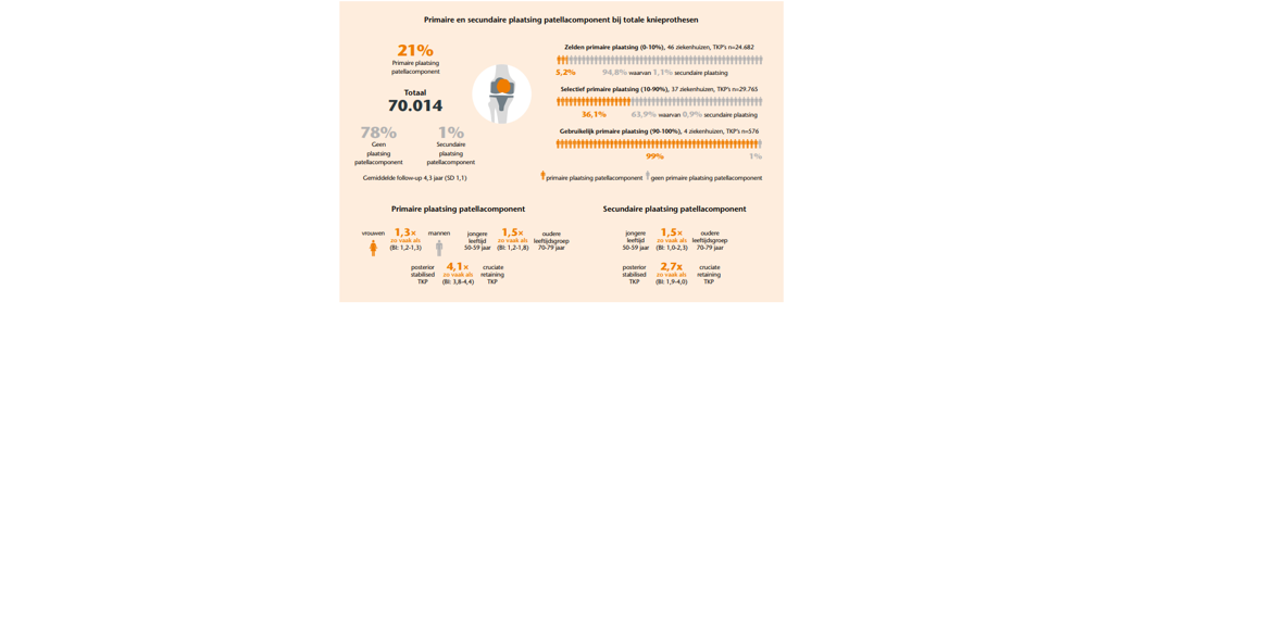 Het onderzoek is uitgevoerd met LROI-data door Bart Robben, Astrid de Vries, Anneke Spekenbrink-Spooren, Rob Nelissen en Reinoud Brouwer. Zij concludeerden dat in Nederland bij 21% van de totale knieprothesen een patellacomponent primair geplaatst wordt en bij 1% secundair. Ziekenhuizen die zelden een patellacomponent primair plaatsen, plaatsen niet vaker een patellacomponent bij een tweede ingreep dan ziekenhuizen die dit selectief doen. Het primair of secundair plaatsen van een patellacomponent wordt geassocieerd met het gebruik van posterior stabilised design en jongere leeftijd.