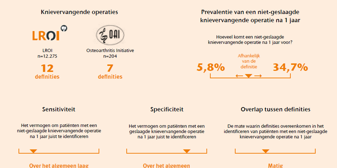Het onderzoek is gefinancierd met LROI-subsidie en uitgevoerd door Malou te Molder, Michelle Dowsey, José Smolders, Liza van Steenbergen, Cornelia van den Ende en Petra Heesterbeek. Zij concludeerden dat uit een vergelijking tussen 15 definities van een niet-geslaagde knievervangende operatie bleek dat het voorkomen van een niet-geslaagde knievervangende operatie sterk varieerde, afhankelijk van de gebruikte definitie. Over het algemeen was het moeilijk om een niet-geslaagde knievervangende operatie te identificeren met deze definities (lage sensitiviteit), maar de meeste definities waren wel goed in het vaststellen van wie geen problemen had na de operatie (hoge specificiteit). Omdat de verschillende definities maar matig met elkaar overlapten meten ze waarschijnlijk verschillende aspecten van een niet-geslaagde knievervangende operatie. Het gebruik van één internationale op consensus gebaseerde definitie zou het vergelijken van resultaten over de tijd en tussen orthopeden, ziekenhuizen en landen vergemakkelijken. Dit onderzoek heeft geholpen om beter te begrijpen wat patiënten bedoelen met een niet-geslaagde knievervangende operatie.