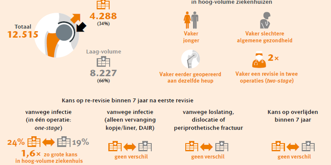 Zij concludeerden dat ziekenhuizen die veel heupprothese revisies uitvoeren over het algemeen geen betere resultaten hebben dan ziekenhuizen met minder eerste revisies. Bij eerste revisies om een andere reden dan infectie – zoals loslating, dislocatie of periprothetische fractuur – is de kans op een re-revisie vergelijkbaar. Bij revisies vanwege infectie (in één operatie; one-stage) is dat risico juist hoger in ziekenhuizen die veel revisies uitvoeren. In deze ziekenhuizen worden ook vaker revisies in twee stappen (two-stage) uitgevoerd. Dit wordt meest waarschijnlijk veroorzaakt door een meer complexe patiëntpopulatie en regionale verwijsafspraken voor complexe infectieproblematiek. Op basis van deze resultaten is er geen bewijs voor het instellen van een volumenorm (verplicht minimumaantal revisies).