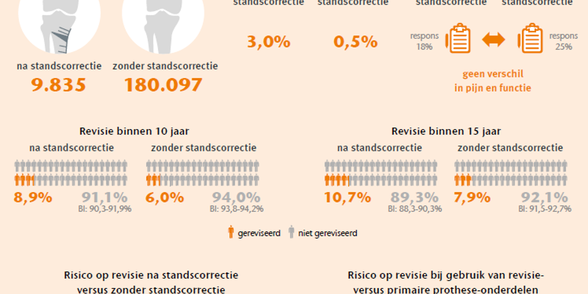 Het onderzoek is uitgevoerd met LROI-data door Maarten Huizinga, Astrid de Bries, Liza van Steenbergen en Reinoud Brouwer. Zij concludeerden dat bij een totale knieprothese na een eerdere standscorrectie vaker revisie-onderdelen nodig zijn dan bij een primaire knieprothese zonder standscorrectie. Ook gaat de knieprothese minder lang mee. Hierbij spelen de revisiecomponenten waarschijnlijk een belangrijke rol. Tot 1 jaar na de operatie zijn er bij de patiënten die vragenlijsten hebben ingevuld geen verschillen gevonden in pijn en functie. Ondanks de beperkingen van dit onderzoek is deze informatie waardevol voor jongere en actievere patiënten met artrose die mogelijk in aanmerking komen voor een standscorrectie.