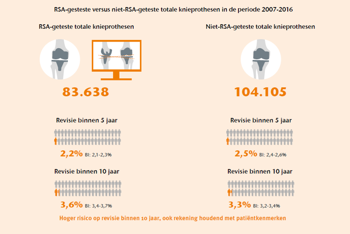 RSA-geteste totale knieprothesen hadden geen lager revisierisico op de lange termijn dan niet-RSA-geteste totale knieprothesen. Een mogelijke verklaring is dat totale knieprothesen in Nederland aan strenge eisen moeten voldoen voordat deze gebruikt mogen worden, waardoor niet-RSA-geteste prothesen al een laag revisierisico hebben. Verder onderzoek is nodig om te bepalen of de verschillen tussen RSA-geteste en niet-RSA-geteste prothesen die in andere landen worden gevonden op basis van gemiddelde cijfers, ook worden gevonden als naar gegevens van individuele patiënten wordt gekeken.
