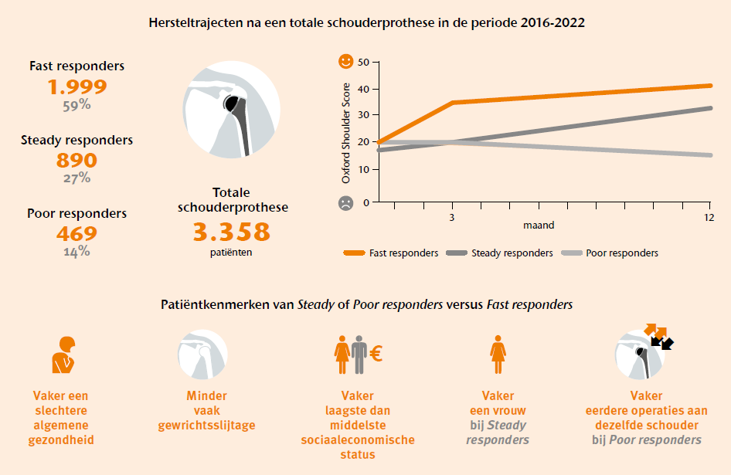Na een totale schouderprothese volgen patiënten drie verschillende hersteltrajecten. De meeste patiënten herstellen snel en goed (Fast responders, 59%), terwijl anderen meer tijd nodig hebben (Steady responders, 27%). Een kleinere groep heeft een minder gunstig herstel (Poor responders, 14%), met aanhoudende klachten. Voorspellers voor dit ongunstige hersteltraject zijn een slechtere algemene gezondheid, minder gewrichtsslijtage, een lagere sociaaleconomische status en eerdere operaties aan dezelfde schouder. Deze inzichten helpen orthopedische chirurgen beter inschatten welke patiënten een minder gunstig hersteltraject kunnen hebben na een totale schouderprothese.