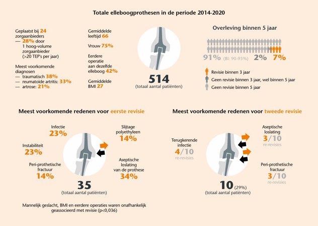 De prothese-overleving en kenmerken die samenhangen met een revisie kunnen door orthopeden en andere orthopedische zorgverleners worden gebruikt om patiëntspecifieke verwachtingen te scheppen en kunnen helpen bij de gezamenlijke besluitvorming tijdens het overwegen van een totale elleboogprothese-ingreep. Daarnaast toont dit onderzoek een opvallend hoog aantal re-revisies, waarnaar verder onderzoek moet worden gedaan.