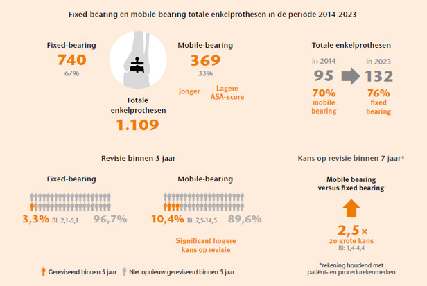Risico op revisie lager bij fixed-bearing dan bij mobile-bearing totale enkelprothesen