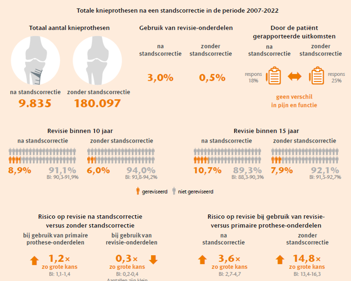 Bij een totale knieprothese na een eerdere standscorrectie zijn vaker revisie-onderdelen nodig dan bij een primaire knieprothese zonder standscorrectie. Ook gaat de knieprothese minder lang mee. Hierbij spelen de revisiecomponenten waarschijnlijk een belangrijke rol. Tot 1 jaar na de operatie zijn er bij de patiënten die vragenlijsten hebben ingevuld geen verschillen gevonden in pijn en functie. Ondanks de beperkingen van dit onderzoek is deze informatie waardevol voor jongere en actievere patiënten met artrose die mogelijk in aanmerking komen voor een standscorrectie.
