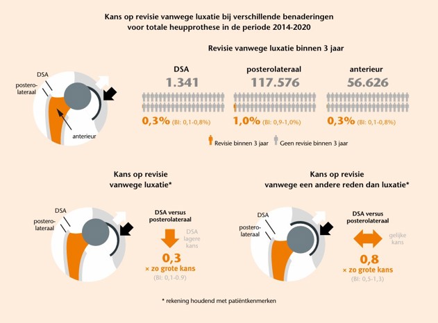 Met LROI-data onderzochten we de samenhang tussen de chirurgische benadering en het revisiepercentage vanwege luxatie en revisie voor elke andere reden dan luxatie. Hiervoor werden de resultaten van DSA vergeleken met die van de anterieure en posterolaterale benadering. Revisiepercentages en het risico op revisie zijn berekend, rekening houdend met patiëntkenmerken.