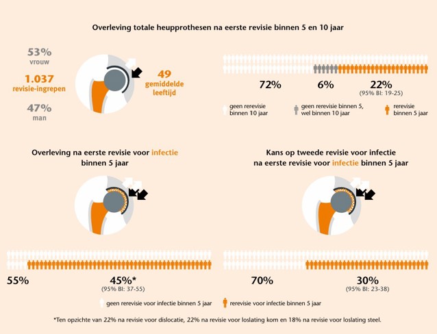 Het faalpercentage van revisie-ingrepen bij jonge patiënten is hoog. Met name de overleving van revisie-ingrepen bij infectie is zorgelijk. Management van infecties speelt een belangrijke rol in het voorkomen van revisies en re-revisies.