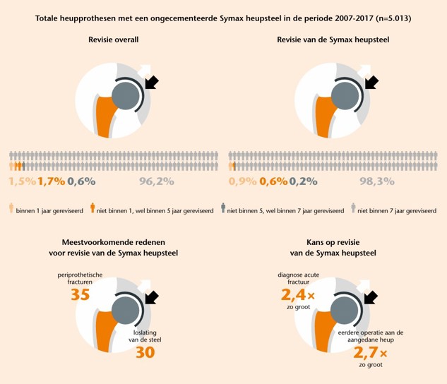 Deze landelijke registerstudie laat zien dat de revisiepercentages van de Symax heupsteel vergelijkbaar zijn met die van de best presterende ongecementeerde totale heupprothesen in Nederland. Een primaire diagnose van een acute fractuur, en een eerdere operatie aan de aangedane heup in de voorgeschiedenis waren geassocieerd met een hogere kans op revisie van deze steel. Het wordt dan ook afgeraden de Symax heupsteel te gebruiken bij deze patiënten.