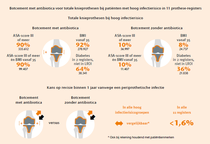 Bij patiënten met een verhoogd risico op infectie (ASA-score III of meer, BMI vanaf 35 of diabetes) lijkt het gebruik van botcement met antibiotica niet gepaard te gaan met een lager risico op revisie vanwege een periprothetische infectie. Klinische studies zijn nodig om te bepalen of botcement met antibiotica extra voordeel biedt.