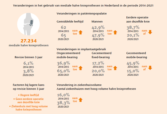 Het gebruik van de halve knieprothese tussen 2014 en 2021 is veranderd. Deze prothese werd steeds vaker geplaatst in ziekenhuizen met een hoog volume halve knieprothesen, bij oudere patiënten en bij patiënten zonder eerdere operaties aan dezelfde knie. Daarnaast werd vaker gekozen voor ongecementeerde mobile-bearing prothesen en voor gecementeerde fixed-bearing prothesen. Deze veranderingen in patiënt- en ziekenhuiskenmerken kunnen mogelijk hebben bijgedragen aan de verbeterde overleving van de halve knieprothese in de afgelopen jaren. Dit benadrukt het belang van het continu monitoren van deze veranderingen en hun samenhang met de overleving van de halve knieprothese om de kans op revisie te verkleinen.