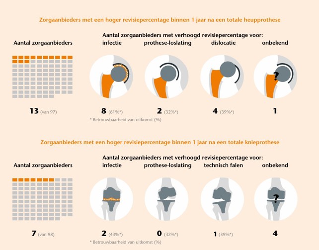 Als het revisiepercentage binnen 1 jaar na een primaire totale heup of knieprothese (THP/TKP) van een bepaalde zorg aanbieder hoger is dan van andere Nederlandse zorgaanbieders, kan dat betekenen dat de kwaliteit van zorg van die zorgaanbieder voor verbetering vatbaar is. Voorwaarde is dat het verschil betrouwbaar is en niet berust op toeval. Een volgende vraag is dan: kunnen we ook aangeven op welk gebied de zorgaanbieder zou moeten verbeteren? Deze vragen hebben we beantwoord, gebruikmakend van data van alle 86.468 primaire THP en 73.077 primaire TKP-ingrepen uit de LROI, uitgevoerd in respectievelijk 97 en 98 ziekenhuizen in de periode 2014-2016.
