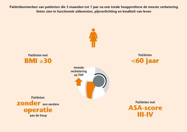 Patiënten die 1 jaar na een primaire totale heupprothese de meeste verbetering lieten zien in functionele uitkomsten, pijnverlichting en kwaliteit van leven (PROMs), zijn jonger dan 60 jaar, vrouw, hebben een hoge ASA-score, een hoge BMI en geen eerdere operatie aan de heup ondergaan.